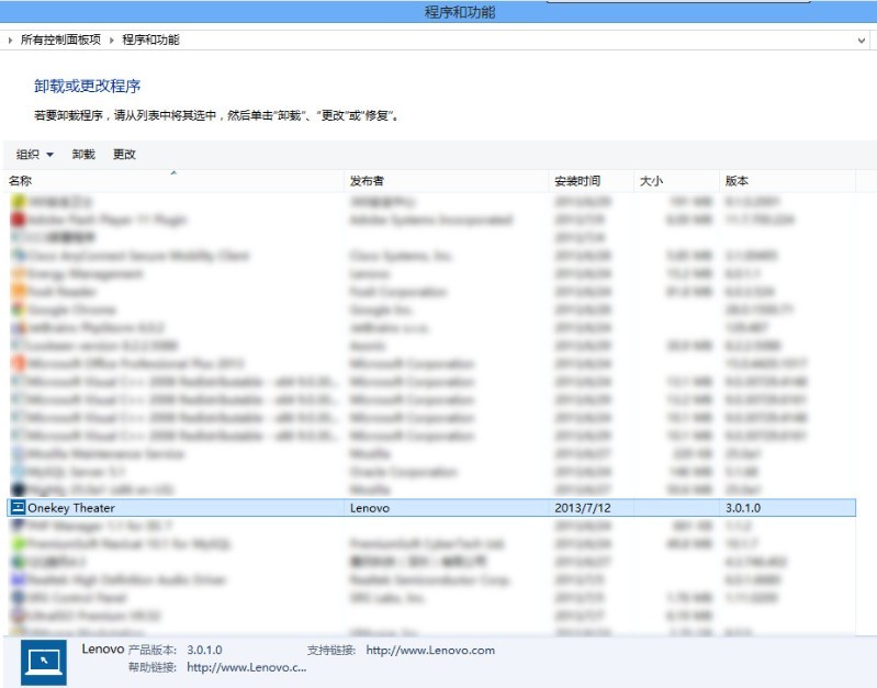 1. 首先需要确认,是否已经在Win8下安装过了一键影音功能,可检查卸载程序列表中是否有一键影音程序,如下图: