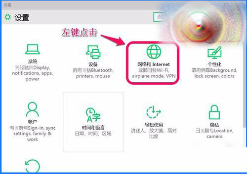2、在打开设置窗口里面,左键点击网络和Internet选项;