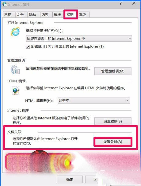 4、Internet属性窗口打开之后,点击程序,在程序标签下面的文件关联选项里面点击"设置关联(A)";