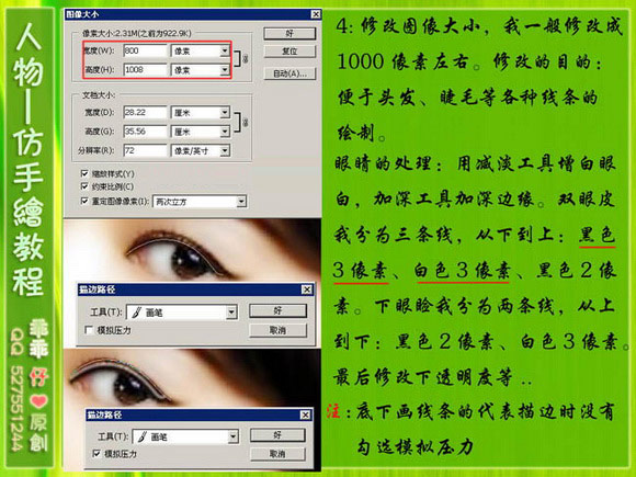 4、修改图像大小,修改成1000像素左右,修改的目的在于便于头发、睫毛等各种线条的绘制。眼睛的处理:用减淡工具大致的增白眼白部位。加深工具加深边缘。