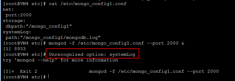 一开始,配置之后,启动服务的时候,老是提示:“unrecognized option: systemLog ” (如下图)