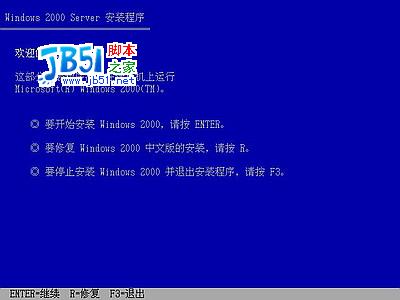 (如果你已经知道方法请转到下一步),将2000安装光盘放入光驱,重新启动系统并把光驱设为第一启动盘,保存设置并重启,如无意外即可见到安装界面: