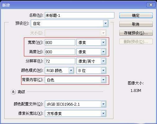 1、新建一个PS图层,宽度:800px,高度:800px,背景内容:白色