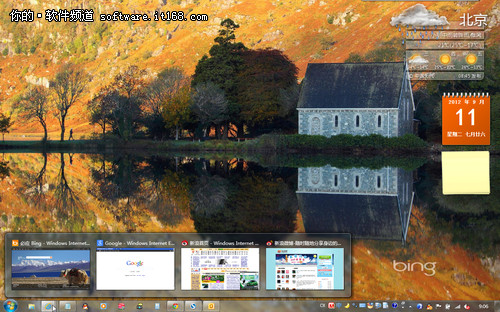 在Win7中,将鼠标停留在任务栏左侧的某个程序图标上,任务栏中该程序图标上方即会以显示该类已经打开所有内容的小预览窗口。