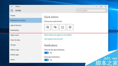 Windows 10的新操作中心和Mac OS X有点类似,点击屏幕右下角的对话框图标即可调出,选择所有设置-通知和操作即可自主定制哪些事项需要通知。