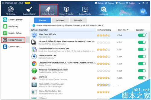 (1)运行wise care 365,依次点击系统优化 -> 启动项管理 -> 启动项