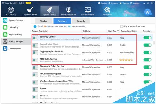 (1)运行wise care 365,依次点击系统优化 -> 启动项管理 -> 服务