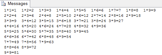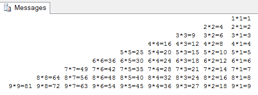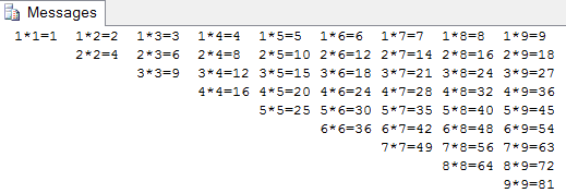 DECLARE @I INT ,@J INT,@S VARCHAR(100) SET @I=1 WHILE @I<10 BEGIN SET @J=@I SET @S='' WHILE @J<10 BEGIN SET @S=@S+CAST(@I AS CHAR(1))+'*'+CAST(@J AS CHAR(1))+'='+CAST((@I*@J)AS CHAR(3)) SET @J=@J+1 END PRINT @S SET @I=@I+1 END