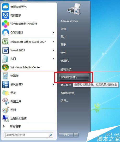 1、点击开始按钮,打开“设备和打印机”菜单。