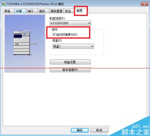 3、打开属性菜单后,会出现一个显示打印机属性的窗口,单击“配置”选项卡,勾选“选件”下的“自动双面单元”。