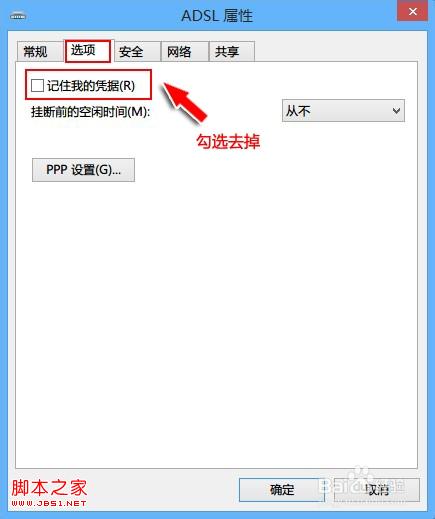 在“属性”面板中,我们选择“选项”,然后将“记住我的凭据”前面的勾选去掉,点击"确定"