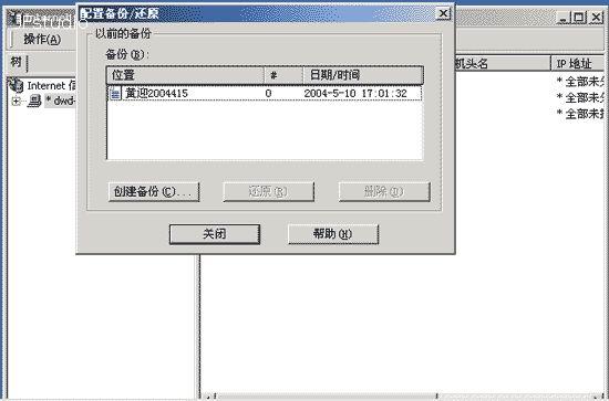 我就是这样做的,自从教了那个网管后,客户再也没有打过电话了,噢!!对了差点走题了,还要给大家说说么样恢复。做了备份后,如果你的IIS的配置被改了后,你就可以选择恢复到你当时备份时的配置了。同上面一样打开"Internet服务管理器",也是在原来的服务器名称上右击,在弹出的菜单中点击"备份/还原配置",会出现图2: