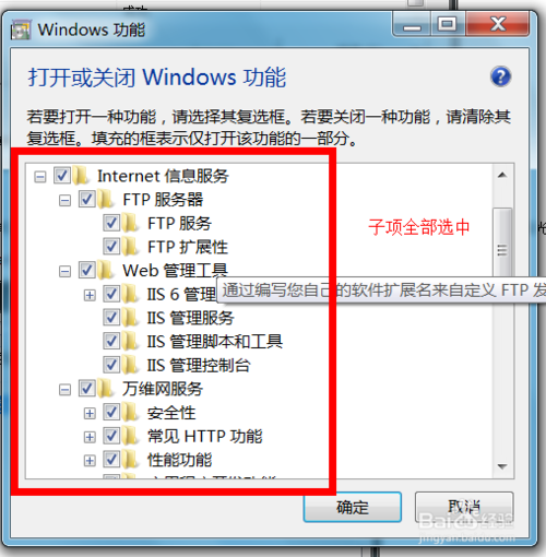 3.Internet信息服务及下面的子栏目全部打上对勾;