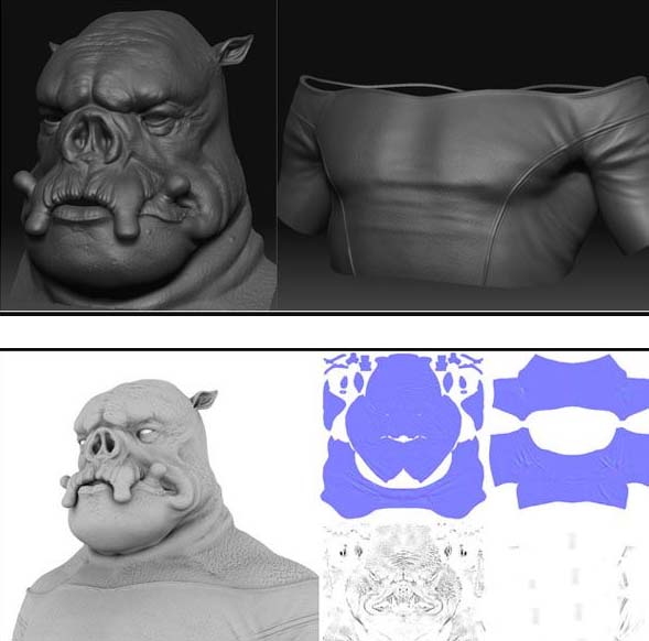 1、我开始时用Subtool 和basic sculpting tools来塑造外形和制作细节。觉得满意之后,将保留有大体棱廓还不会严重影响渲染时间的细分网格导入到Maya。剩下来的细节就是用ZBrush导出的normal 和cavity图来完成的。