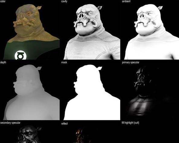 我合并了反射贴图和凹凸贴图,还有cavity贴图,来生成我的贴图的主要部分。因为我的目的是想生成一个静帧图片,我在Photoshop中依据我的主要渲染摄像机,绘制了我的贴图,然后用camera projection 技术导回了我的模型上
