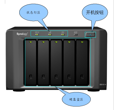 注:不同型号的前后面板设计不相同。指南中使用的设备统一为ds1511+;这不会影响到软件的使用,软件界面的使用都是统一的DSM管理。
