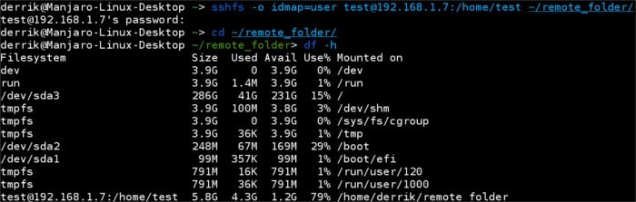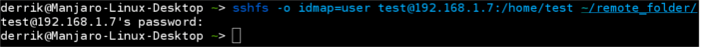 注意: 也可以通过 SSH 密钥文件挂载 SSHfs 文件系统。只需要在上面的命中用 sshfs -o IdentityFile=~/.ssh/keyfile, 替换 sshfs -o idmap=user 部分。