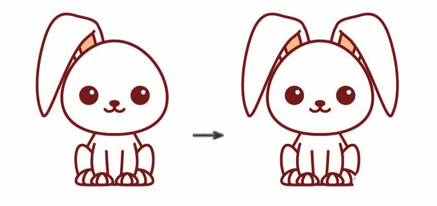 最后,在下图标示的地方剪掉一小部分形状:使用直接选择工具(A),点击下图红色圆圈标出的锚点,删除这部分不需要的线段。兔子的耳朵就做好了。