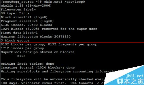 3、格式化设备:mkfs.ext3 /dev/loop0