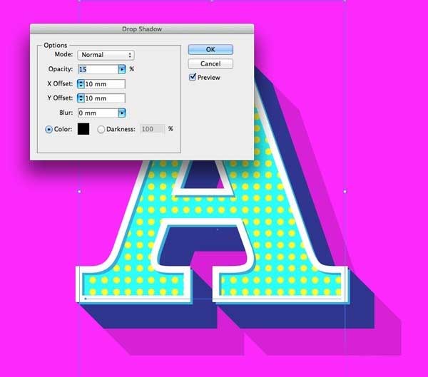 15、回去的效果菜单,然后选择风格化>阴影。调整设置为正常,15%的不透明度为10mm X&Y偏移和0毫米模糊。这将创建另一个纯色抵消,但这次的降低不透明度是一个很酷的长长的阴影效果。