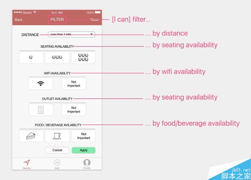 页面的“阅读量”是怎么计算的?你的页面标题是过滤器,但是你头部显示的是距离。另外这个页面可以过滤出座位数量,Wifi可用性,可用空间和食品饮料。但是你能向你的朋友们解释一下这个页面的功能是什么吗?这个页面的结构是合理的吗? 他们的命名是否都是合理的?