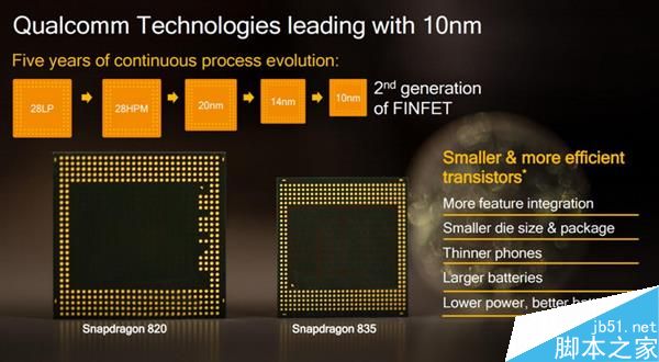 以上两家都相对小众,但是2017年将与它们竞争性能宝座的第三位选手就真的非常“大众”了——那就是高通,以及它们的骁龙82x、835。高通自从在骁龙810时代被ARM公版架构坑过一次之后,之后旗舰产品都是自主架构了:骁龙835使用了改进的Kyro280架构,并且核心数量也再次回归八核。最重要的是,作为业界首款10nm制程手机SOC,骁龙835的功耗比备受好评的骁龙820更低!