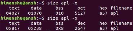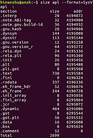size 的基本用法很简单。你只需要将目标文件/可执行文件名称作为输入就行了。下面是一个例子: