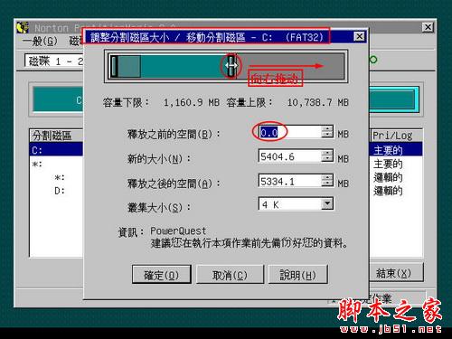 这里一定要释放D盘头部的空间,因为C盘和D盘是相连的,这样释放出来的空间就可以直接分配给C盘。如果是释放D盘的尾部空间,因C盘尾部与D盘尾部不相连而导致释放出来的空间无法分配给C盘。这一点尤为重要。这一部操作完之后,点击“确定”按钮来保存刚才的操作。
