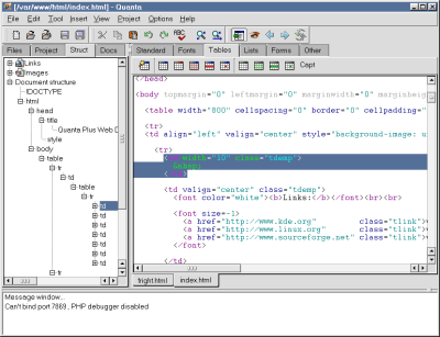 Quanta Plus是一款Web集成开发环境,可以用来开发HTML, XHTML, CSS, XML, PHP 以及任何XML风格的语言或脚本语言。Quanta Plus既提供了可视化的所见即所得(WYSIWYG)编辑器,又能允许你手工编辑。它的特点有标记自动补全、标记属性的对话框编辑器、脚本语言变量的自动提示、项目管理、动态预览、PHP调试器、CVS支持、SVN支持等。