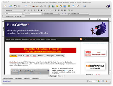 BlueGriffon是一款所见即所得的Web内容编辑器。它是基于Gecko——火狐浏览器的HTML渲染引擎开发的,使用它,你可以开发出标准的Web页面。它可以运行在的Windows、Linux以及苹果系统上。