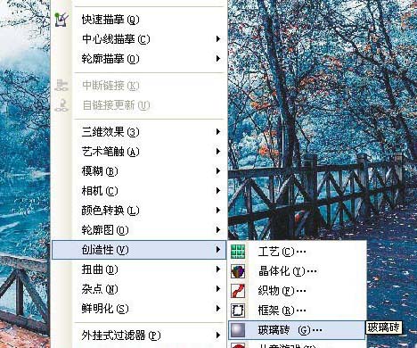 3、然后,鼠标左键单击菜单【位图】>>【创造】>>【玻璃砖】,如下图所示。给素材图片添加一个玻璃砖效果。