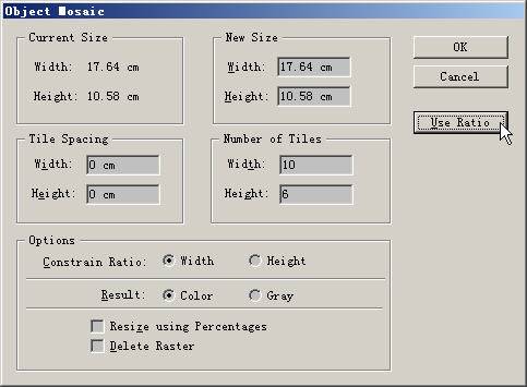弹出对话框后,点USE RATIO,使用图片的原比例。然后你会看到NUMBER OF TILES里的宽和高都有变化,那是图片按照比例分割出来的块数,但是块数太少,我们可以适当增加几倍,我增加了4倍,倍数越高运算速度月慢,一定要等倍提高,不然宽和高就变形了!