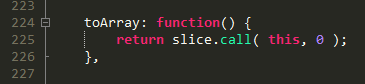225行中,在运行时,this是指向jQuery对象的,通过call语句借鉴slice方法,切割出一个数组出来,这种"借鸡下蛋"的方法,真的是让人拍手叫绝.