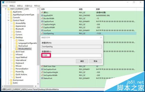 3、在WindowMetrics对应的右侧窗口,找到IconSpacing(图标间距),左键双击IconSpacing打开编辑字符串对话框,IconSpacing的系统默认值为-1125;