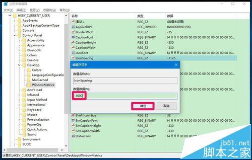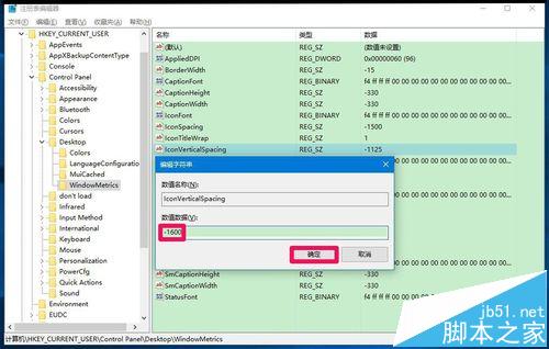 6、根据自己的需要,可以把IconVerticalSpacing的数值数据进行调整,如-1600,再点击:确定;