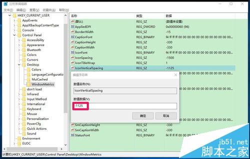 5、在WindowMetrics对应的右侧窗口,找到IconVerticalSpacing(图标垂直间距),左键双击IconVerticalSpacing打开编辑字符串对话框,IconVerticalSpacing的系统默认值也为-1125;