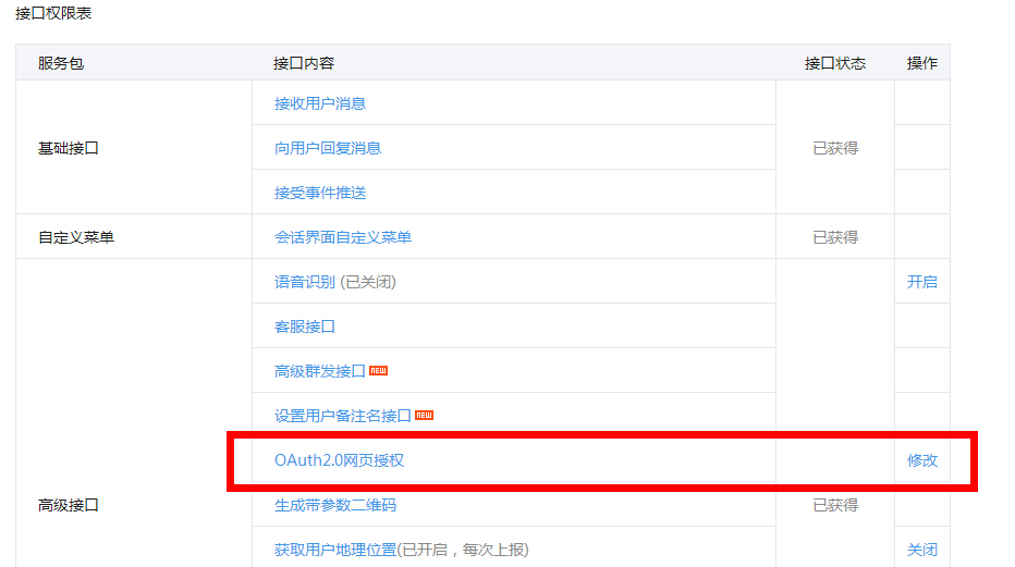 虽然”我的服务“这个页面没有了,但是授权回调域名得设置这个功能还在,开发者可以在左侧的”开发者中心“配置,点开后最后有如图界面,红框中后面的”修改“点击后即可配置,目前为止腾讯的微信公众平台开发文档尚未更新,各开发者如果遇到问题请留意一下: