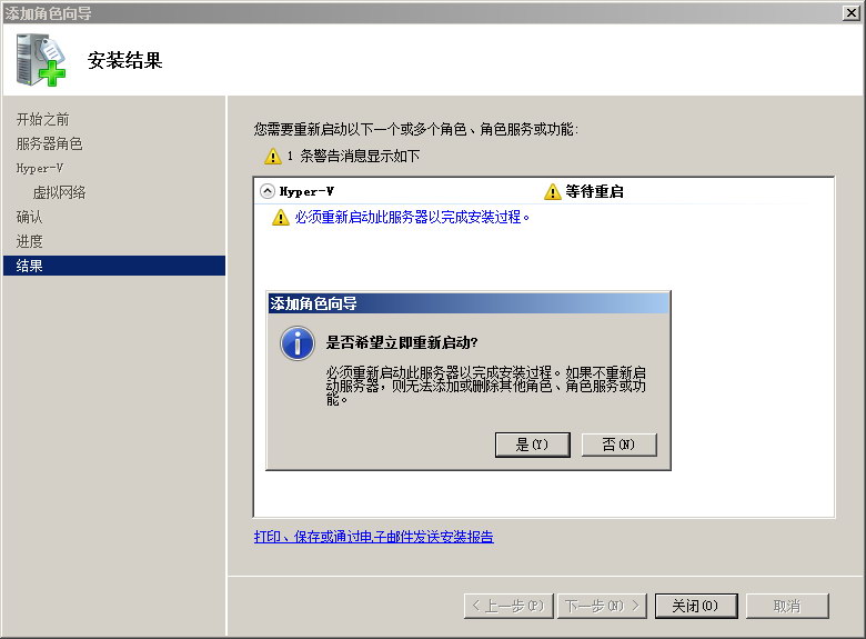 安装进度完成后,点击“关闭”按钮。提示必须重新启动才能完成安装,点击“是”,重新启动。