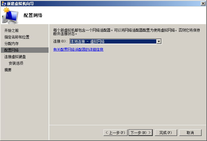 为虚拟机配置网络,虽然前面添加hyper-v功能时,已经选择了,但系统默认是在“未连接”位置上的,还是得选择一次哦。在连接的右边,下拉三角形处点击,选择本地连接。点击下一步。