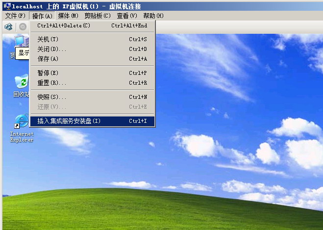 这里我们连接并启动刚才创建的xp虚拟机,在控制台上依次选择“操作”=>“插入集成服务安装盘”。启动后,你会发现虚拟速度很快,鼠标也可以自由出入了,截屏幕也可以使用了等等