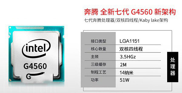 奔腾G4560采用全新Kaby Lake架构,双核心四线程设计,默认主频3.5GHz,3M三级缓存,内置HD 610核心显卡,频率350-1050MHz,热设计功耗54W,相比酷睿i3主要是阉割了AVX2指令集,对于视频编辑影响很大,最大的亮点在于CPU性能出色,不足的地方在于核心显卡性能较低。