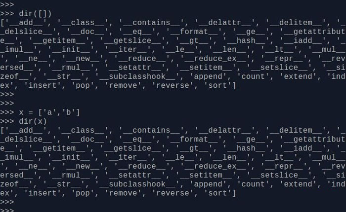 python内置方法有很多,无论是初学还是经通python的程序员都不能全部记住所有方法,这时候dir()函数就非常有用了。使用dir()函数可以查看对像内所有属于及方法,在python中任何东西都是对像,一种数据类型,一个模块等,都有自己的属性和方法,除了常用方法外,其它的你不需要全部记住它,交给dir()函数就好了。