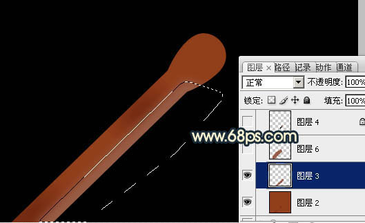 9、新建一个图层,用钢笔勾出火柴顶部的碳化部分选区,用黑色画笔涂黑一点,如下图。