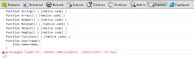 运行到 console.log(nullObj.constructor); 的时候,浏览器报错:Uncaught TypeError: Cannot read property 'constructor' of null。类似的问题也发生在console.log(undefinedObj.constructor); 上面:Uncaught TypeError: Cannot read property 'constructor' of undefined。