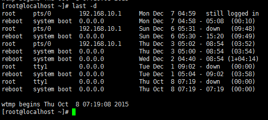 查看系统登录情况last:不带任何参数,显示系统的登录以及重启情况p1