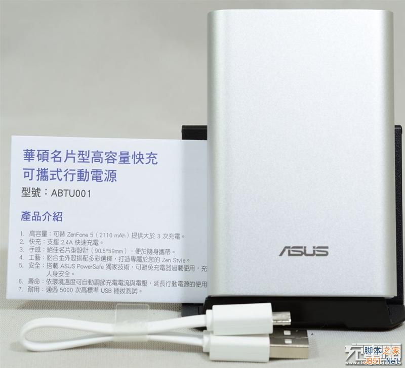 电源外包装为纸盒材质,包装盒上简单展示有产品外观图,产品三大特色:名片型、高容量、快充。并且强调能给ASUS自家的Zenfone 5手机充电大于3次。
