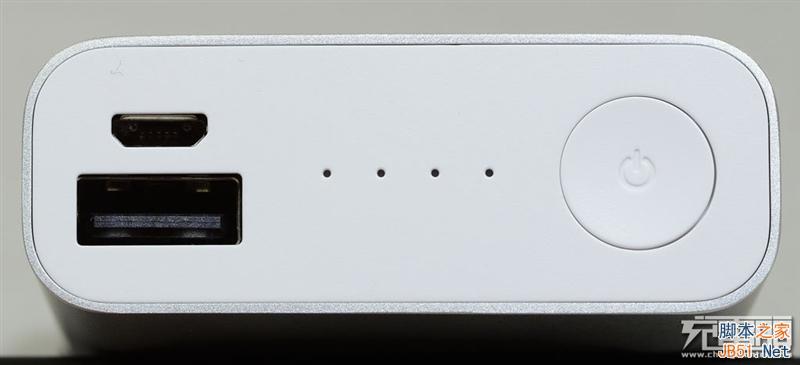 从侧面望过去可见unibody一体成型的方形倒角设计,移动电源两端均为白色塑料装饰片。Micro USB充电输入孔与USB A座输出孔均设计在同一侧,中间为4颗LED电量指示灯,另一侧圆形为电源开关。