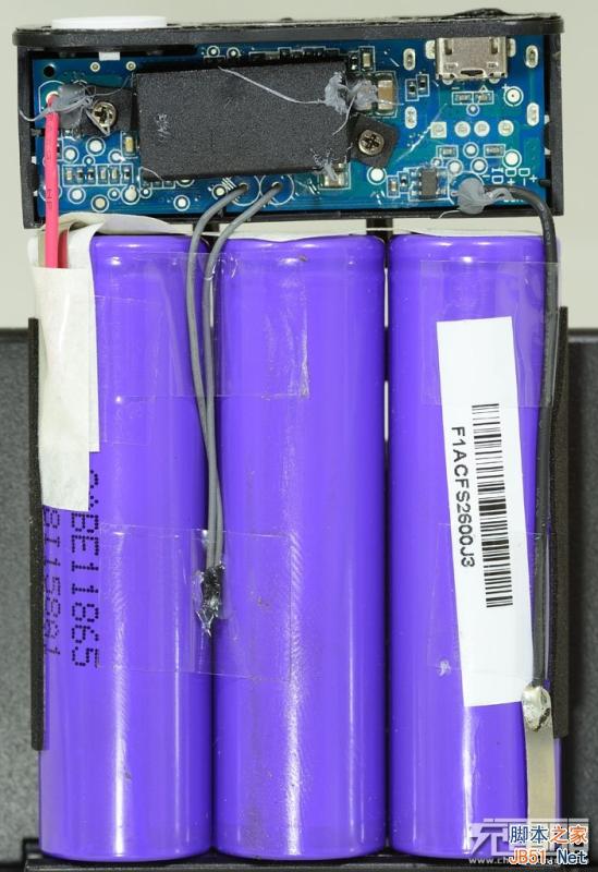 内部结构图来了,9600mAh电池组由三颗18650锂离子电芯并行排列而成。电池组正负极分别由红、黑线连接到PCB电路板上,仅有正极电路有覆盖绝缘片,电池负极焊点直接裸露。电池组上贴有一组条码,方便原厂追溯出厂批次和日期。