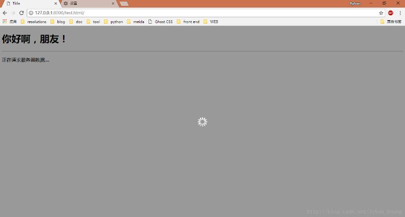 <!DOCTYPE html> <html lang="en"> <head> <meta charset="UTF-8"> <title>Title</title> <!-- 导入css样式 --> <link rel="stylesheet" href="/static/css/loading.css" rel="external nofollow" > <!-- 导入jquery 和 js文件 --> <script src="/static/plugins/jquery-3.2.1.js"></script> <script src="/static/js/loading.js"></script> </head> <body> <h1>你好啊,朋友!</h1> <hr> <div id="content"> <p>正在请求服务器数据....</p> </div> <!-- 模态框部分 --> <div class="loading hide"> <div class="gif"></div> </div> </body> </html>