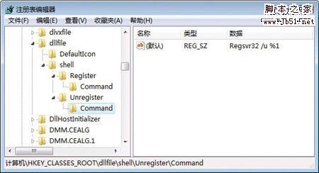 注册或反注册DLL文件也是经常会用到的操作,因此可以将这两项操作也集成至右键菜单中,具体方法是:在注册表HKEY_CLASSES_ROOTDllfileShell分支下分别创建名为“Register”和“Unregister”的子项,修改对应的默认键值为“注册DLL”和“反注册DLL”。然后,在上述创建的子项下级再分别创建名为“Command”的子项,并将注册DLL的“Command”默认键值改为“Regsvr32 %1”;而反注册DLL的“Command”默认键值则改为“Regsvr32 /u %1”。